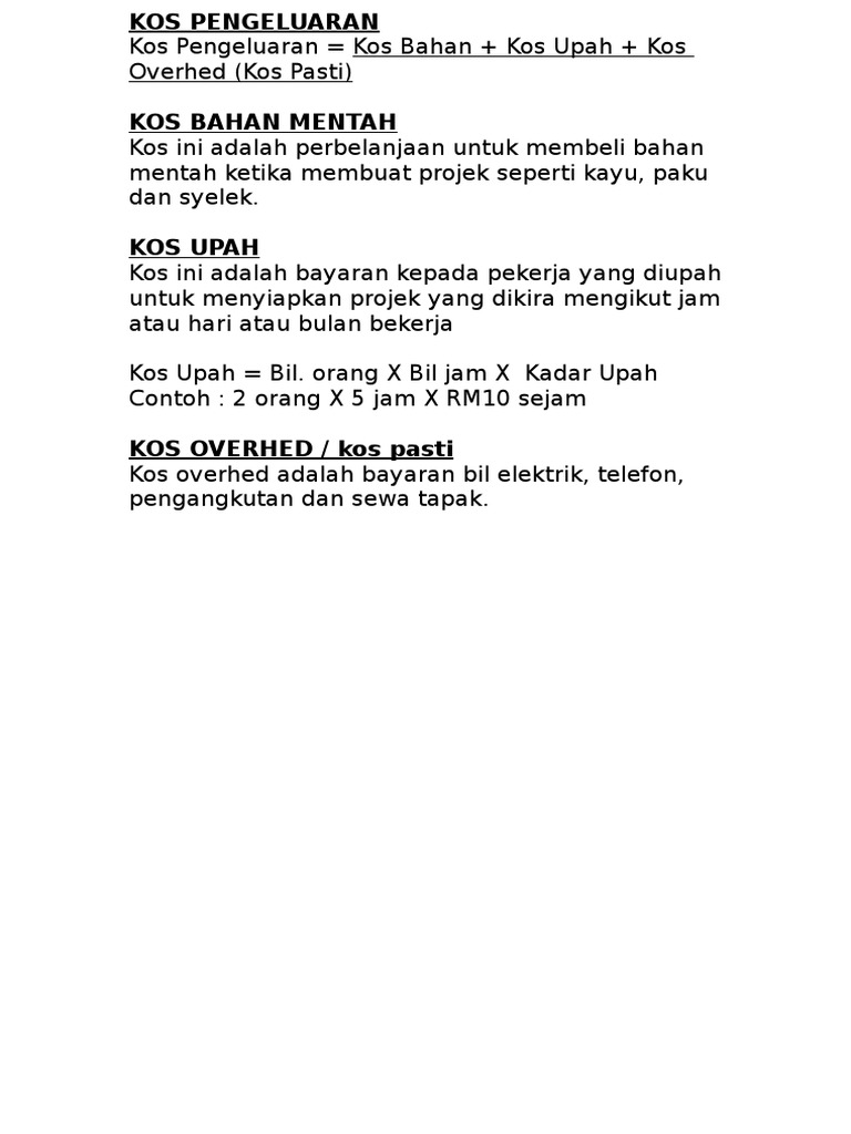 Up to 24 cash back Jenis-jenis Kos Pengeluaran i Kos TetapF - perbelanjaan yang ditanggung oleh firma untuk membiayai input tetap yang digunakan dalam proses pengeluaran. Perbelanjaan tidak lansung seperti kos-kos pengedaran dan kos-kos bahagian jualan sales force adalah. PERAKAUNAN KOS 1 UNSUR-UNSUR KOS.